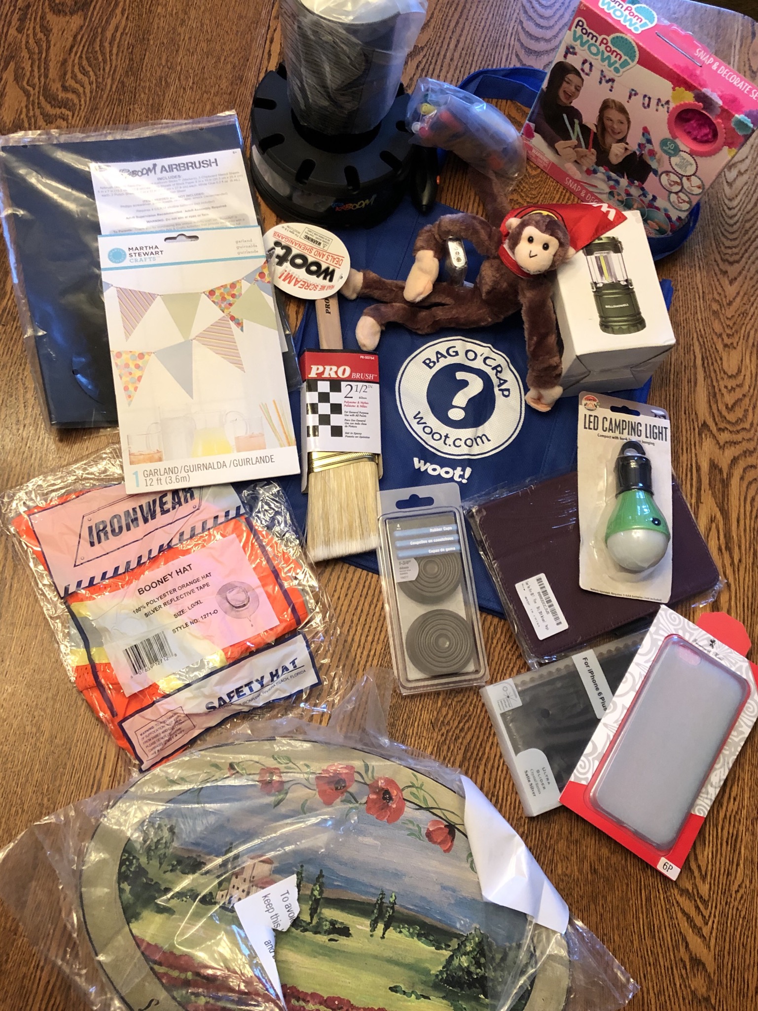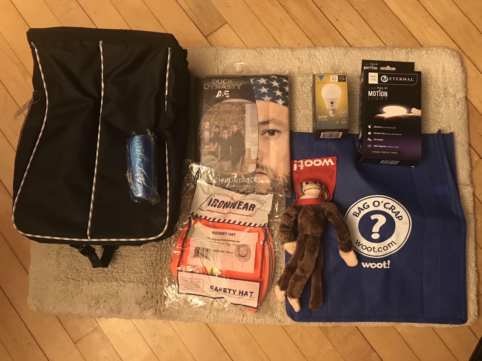 Wow! What a load of crap! I received: a Woot crap bag, a Woot change purse, a women’s XL NY Giants v-neck shirt (my wife is a Panthers fan), a Kansas City Chiefs iPhone case (I’m a Browns fan who uses a Google Pixel 2), I Heart Stamping book, How to Catch an Elf book, some autumn-themed paper napkins, a whisk, an inflatable zombie, a youth XL sweatshirt that I don’t understand (my oldest kid is about to turn 3 so it’ll be awhile before she grows into it), and a 100 pack of plastic mailing envelopes.