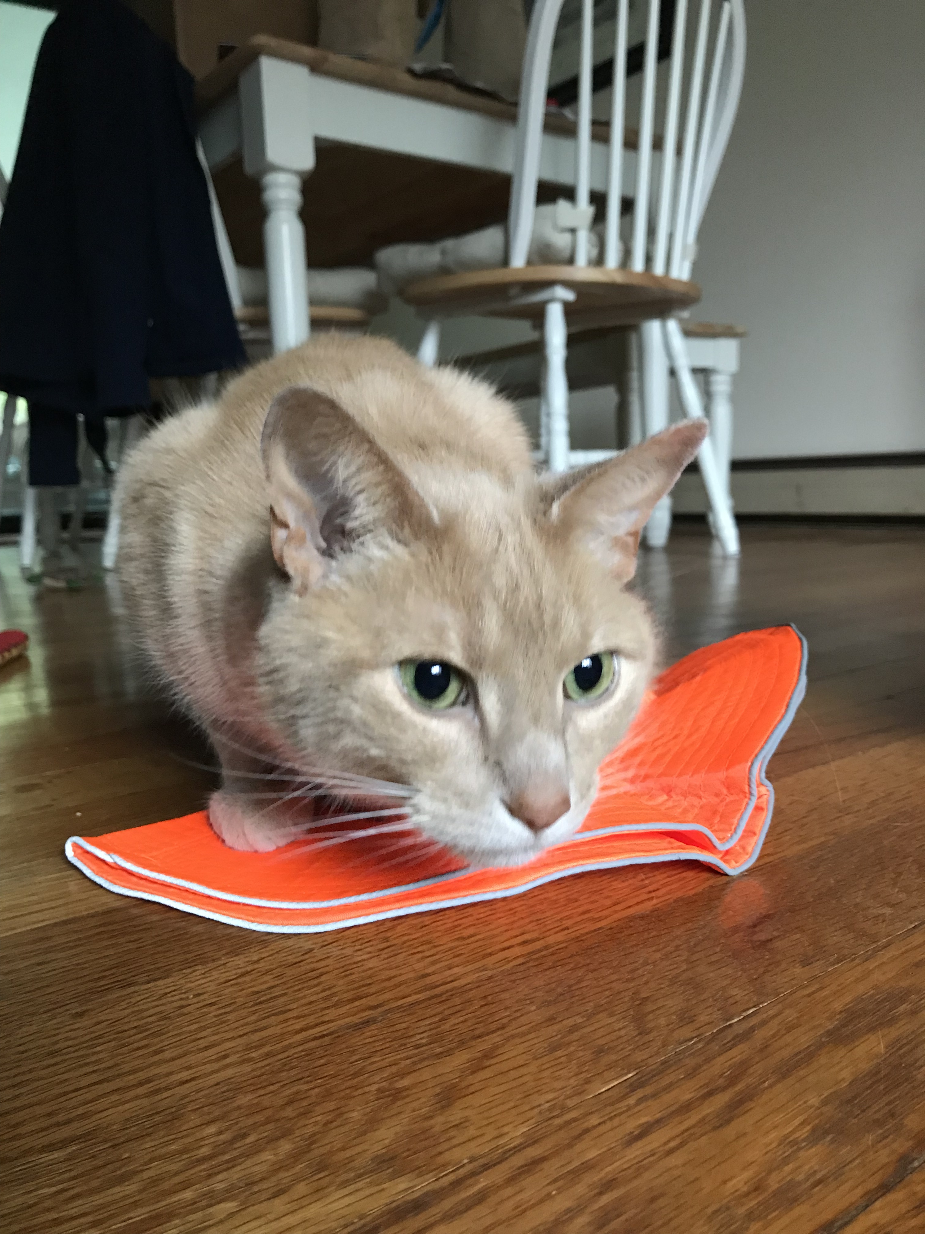 Bright orange safety hat. “How do I get my oldest daughter to wear her bike helmet?” Tell her that she will have to wear something even more ridiculous looking instead. Poof!! It’s in the bag!