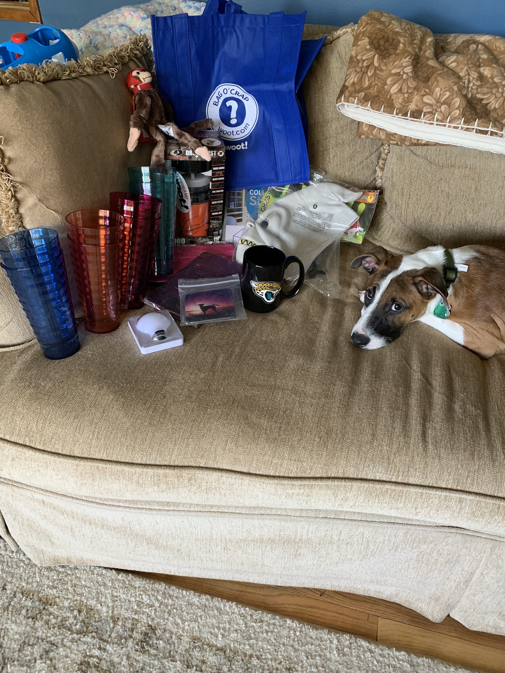 Thank you for my very first Bag of Crap. The disappointment is real. jk, we will be using some of this crap! Favorites= official BOC tote bag, screaming slingshot Morty, sweet rubber cups for under table legs, paint brush, nice cigar lighter. Here’s what I scored: