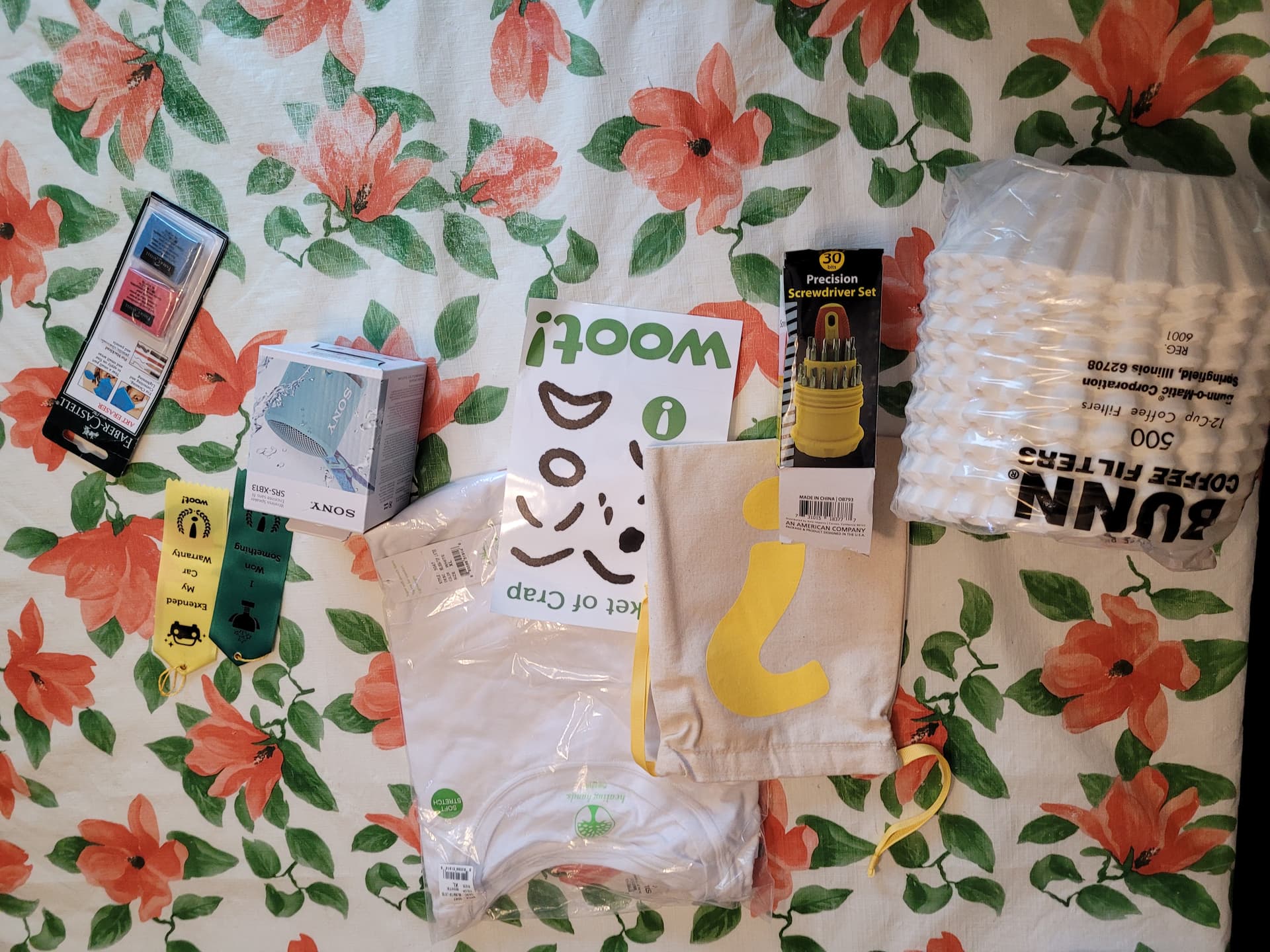 Wireless speaker, lots of coffee filters, long sleeve t, stickers, screwdriver set
