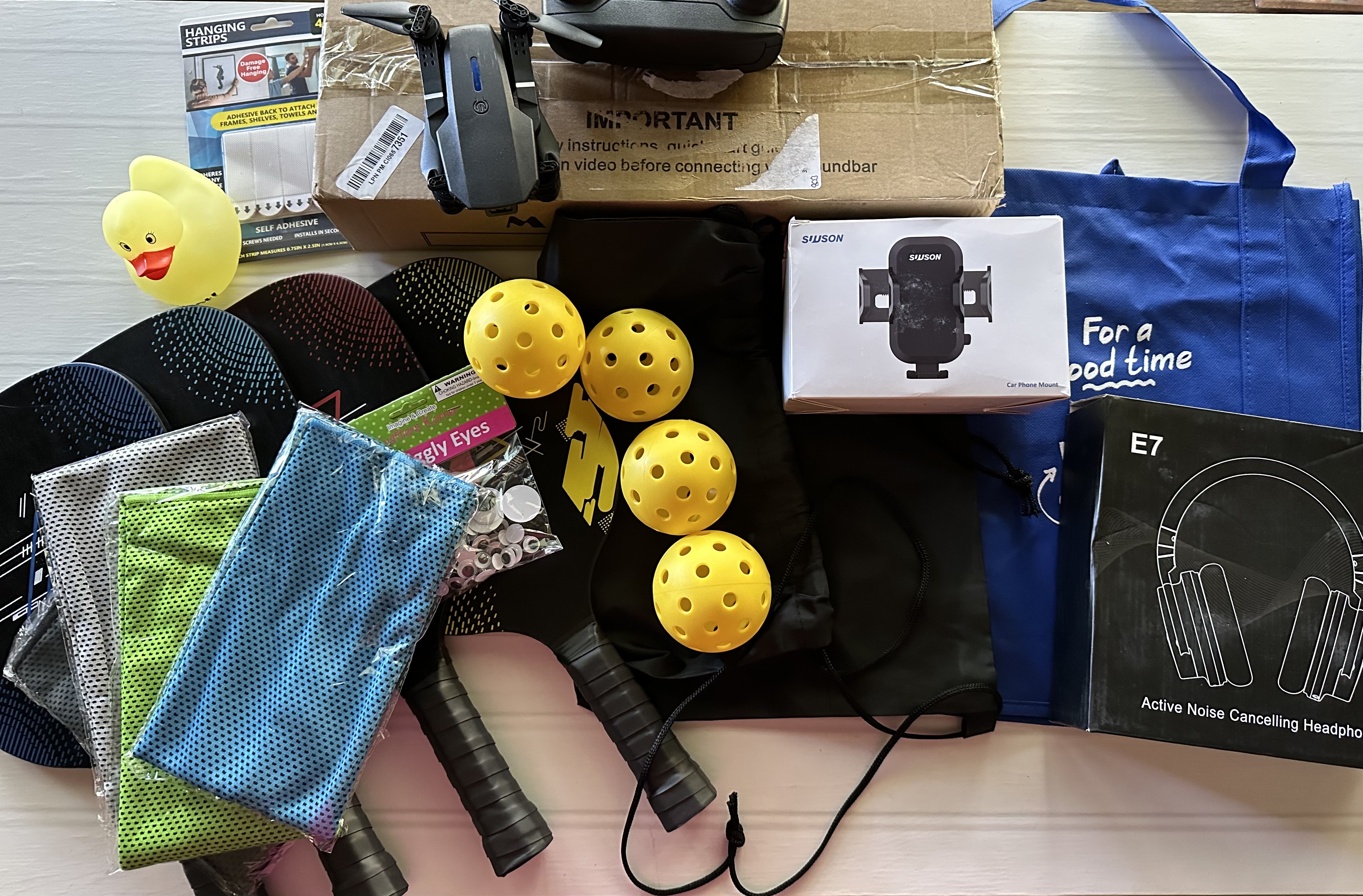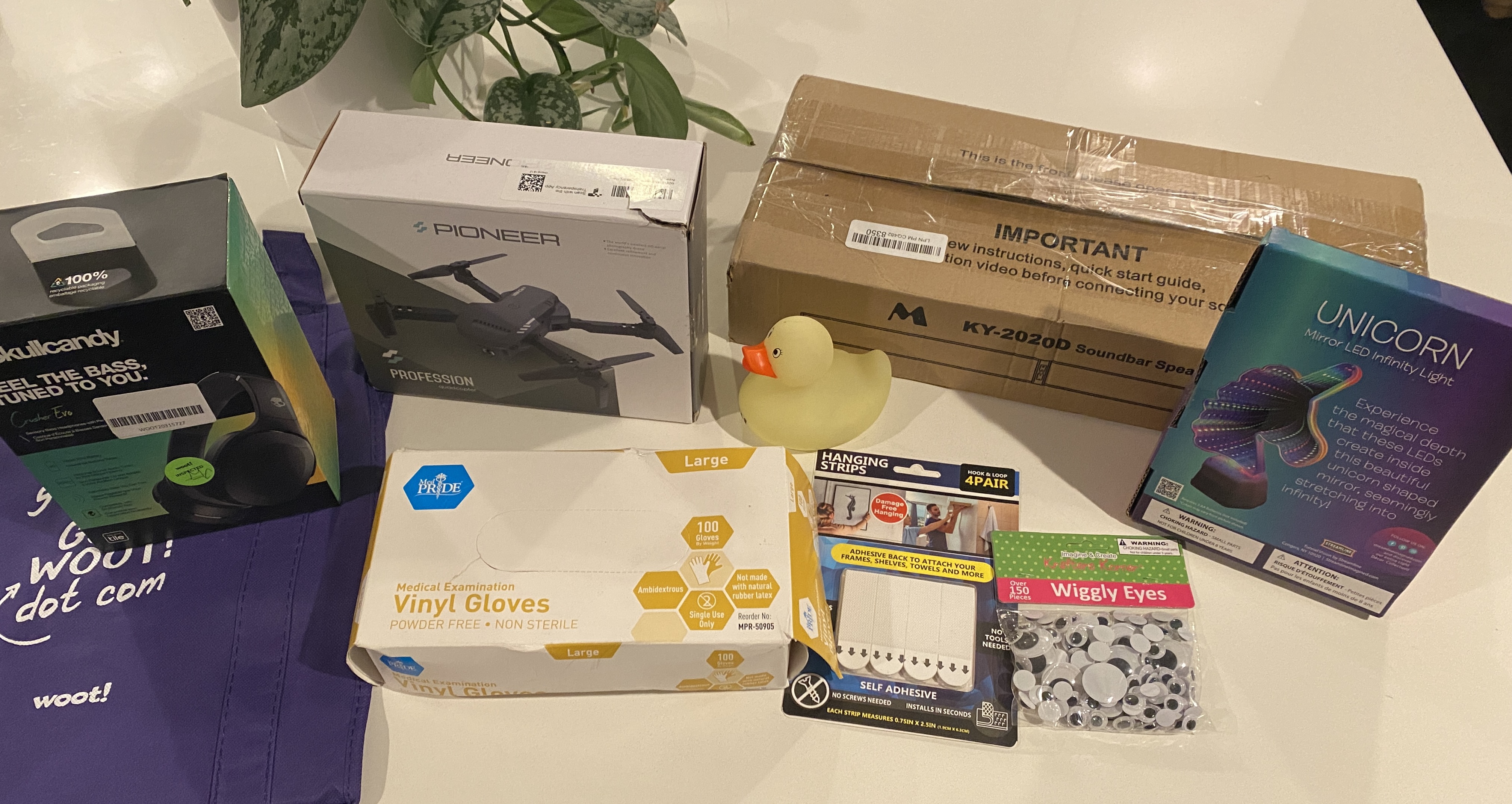 Amazing crap! Skullcandy headphones, pioneer profession quadcopter drone, soundbar speaker, unicorn LED infinity light, medical examination vinyl gloves (funnily enough I actually needed these), self-adhesive hanging strips, wiggly eyes, rubber ducky, and the bag. It honestly felt like this was catered exactly to me. Pinching myself