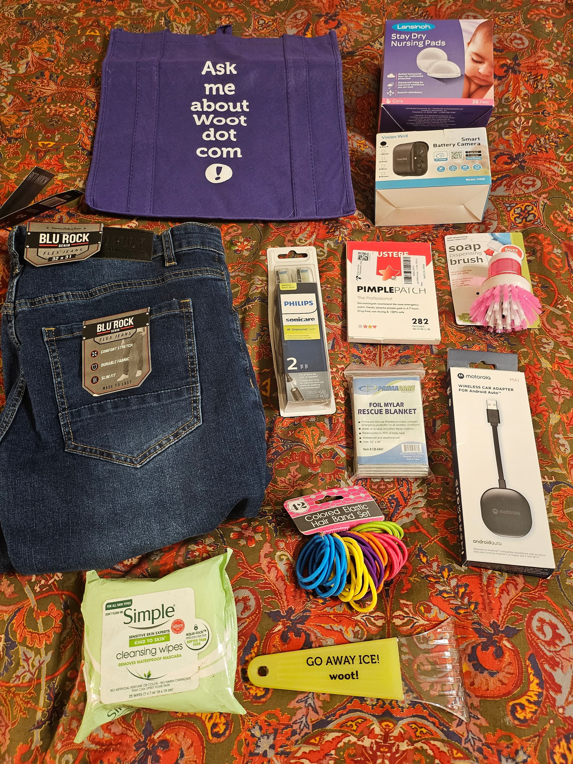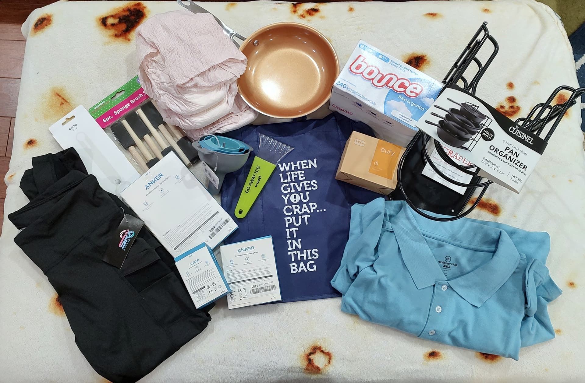 This was a push BOC and was not that disappointing. Several Anker items, some clothing, a pan, a pan rack, foam brushes, an air tag loop, some funnels, a Woot bag, Woot ice scraper, lights, some very large adult diapers, and bounce. What is up with all the bounce lately? I have gotten so many boxes of bounce. Every BOC here lately has had a box of bounce. I have gotten 2 or 3 boxes of bounce in the last few BOCs I’ve won. Hope it doesn’t expire or go weird because I have enough to last a decade now. Thanks Woot for the years of soft, static free clothing!